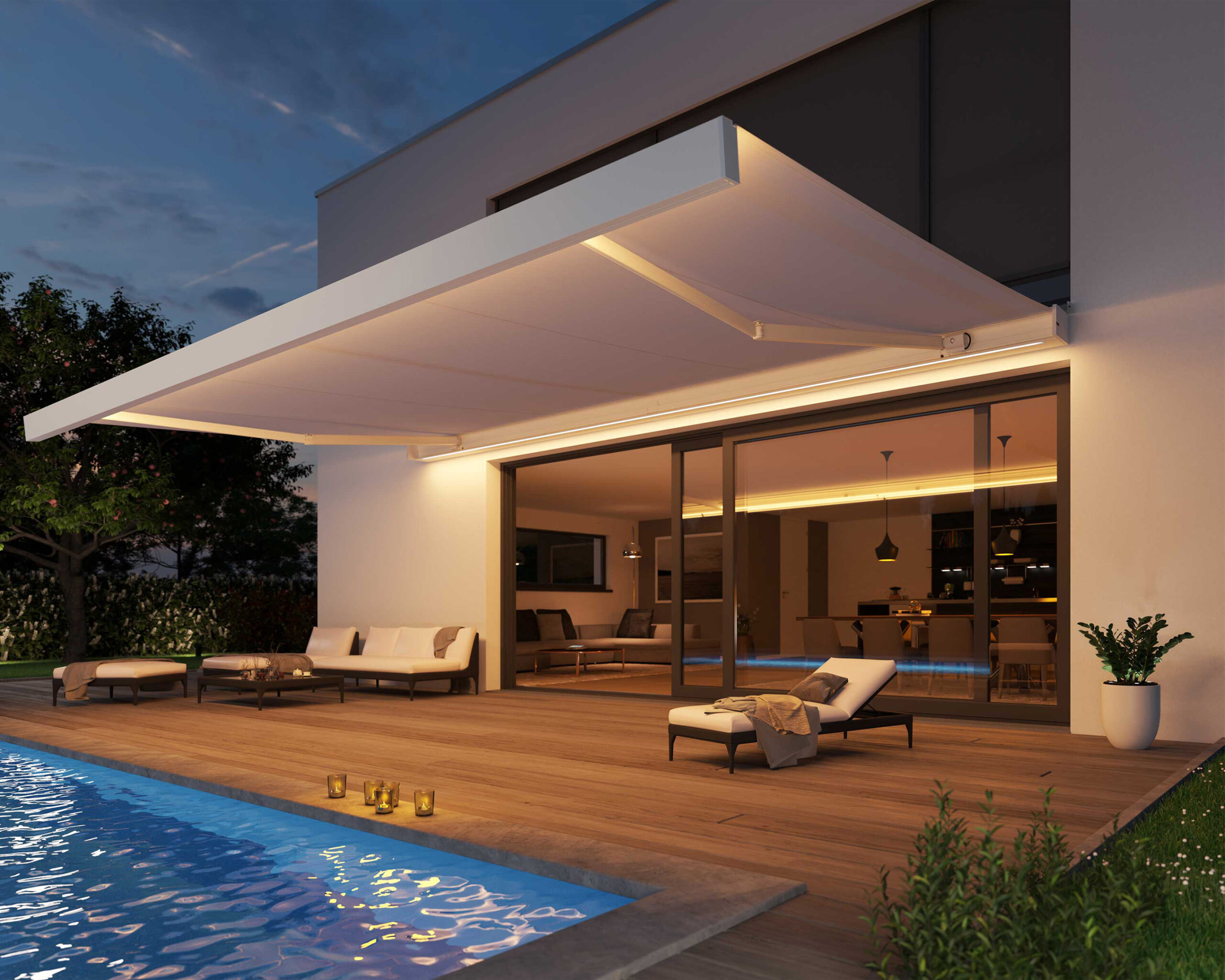 CAMABOX Markisen sind hochwertige Kassettenmarkisen im kubischen Design. Die klare Linienführung wertet das Erscheinungsbild der Fassade auf und ist vor allem auch im geschlossenen Zustand ästhetisch. Die Premium-Markise schützt grossflächige Terrassen und Balkone und sorgt mit der integrierten Beleuchtung für stimmungsvolle Momente. Besonders am Lichteffekt: Dieser ist auch nutzbar, wenn die Markise eingefahren ist. Die schlicht gestaltete Kassette schützt Gelenkarme und Markisentuch vor Witterungseinflüssen und Schmutz.